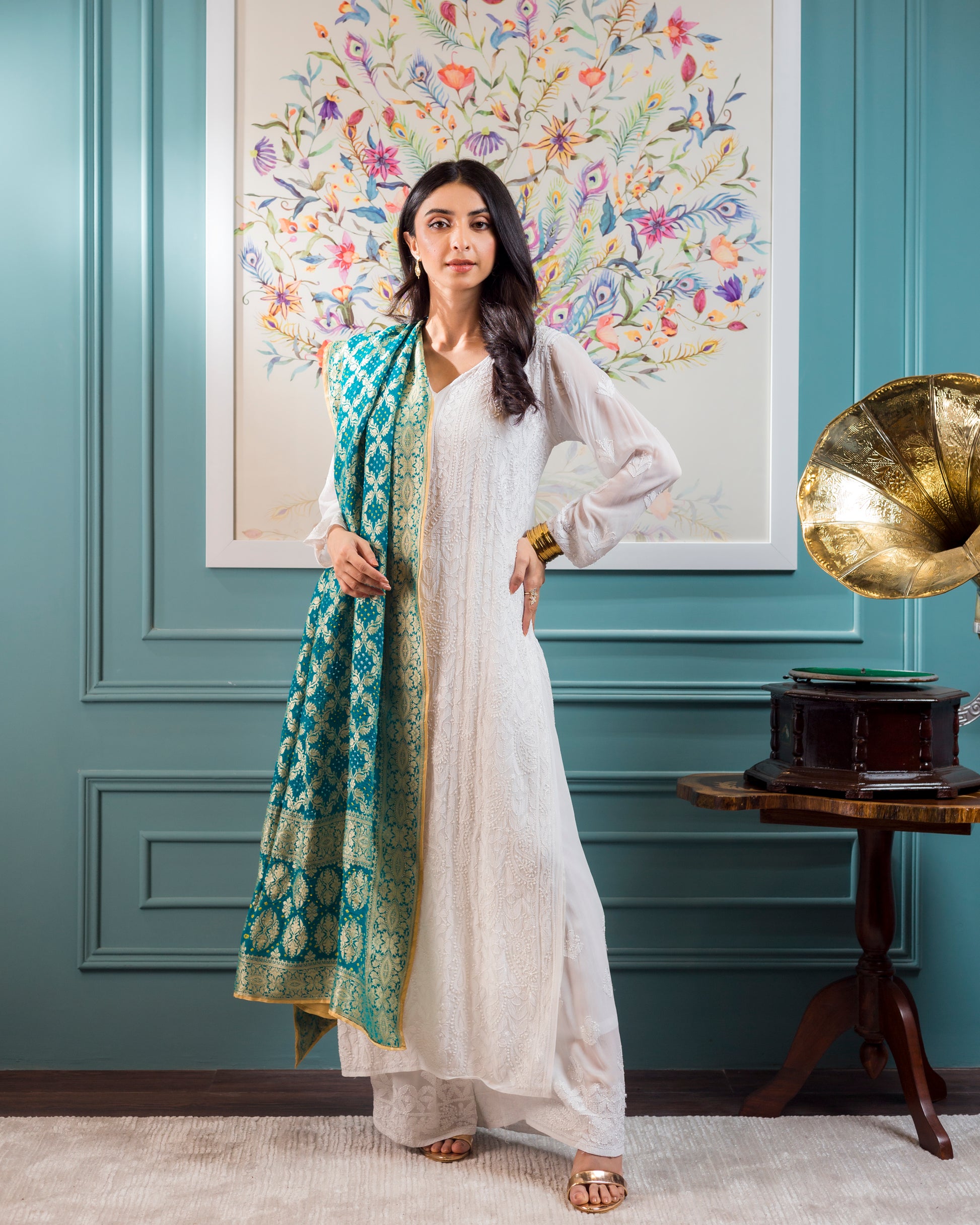 Diva's Resham Full Jaal Chikankari kurtas showcase refined Chikankari craftsmanship on a delicate chiffon base, featuring intricate resham threadwork across the front. The back is adorned with detailed Chikankari bootis, complemented by sleeves worked with a Chikankari border and bootis. The kurta measures approximately 49 inches in length, embodying timeless elegance.
