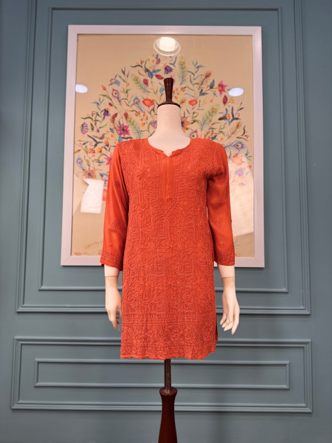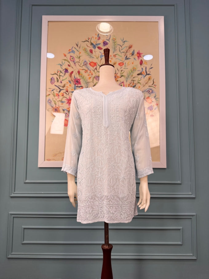 Crafted from delicate chiffon, this Resham Chikankari short kurta features intricate embroidery throughout. The front showcases a detailed Resham Chikankari jaal, while the back is adorned with elegant motif and bootis. The sleeves are finished with a Chikankari border and matching bootis. Versatile in style, it pairs beautifully with ghararas, palazzos, or jeans, allowing you to tailor your look for any occasion with ease.