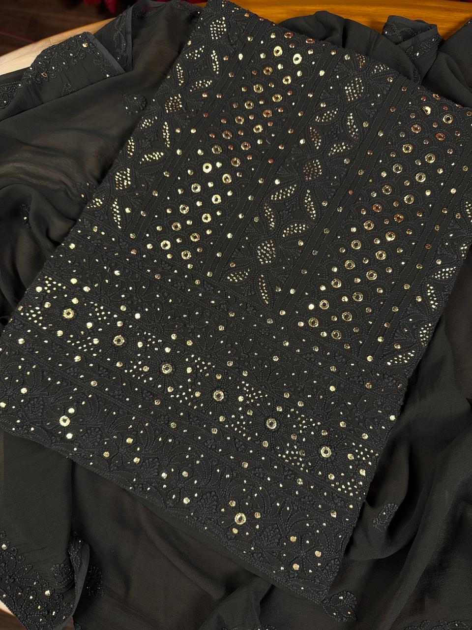 Diva's Mukesh Magic presents an unstitched chiffon Chikankari shirt and dupatta, beautifully embellished with Mukesh taar work that imparts a subtle shimmer. The shirt is designed to fit up to a 50-inch chest and has a length of 49 inches. Complementing it, the 2.75-yard dupatta features an elegant Chikankari border and mukesh-studded bootis, enriching the ensemble with timeless sophistication.